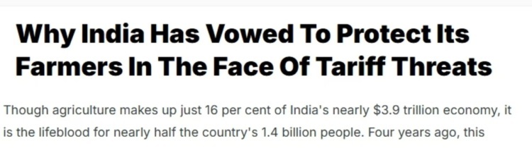印度政府消息人士表示,印方拒绝在美国压力下开放农产品市场是因为,虽然农业及相关产业对印度经济的贡献不到20%,但该国有近一半人口直接或间接依赖该行业,这使其成为任何一届政府都不敢伤害的巨大选民基础。