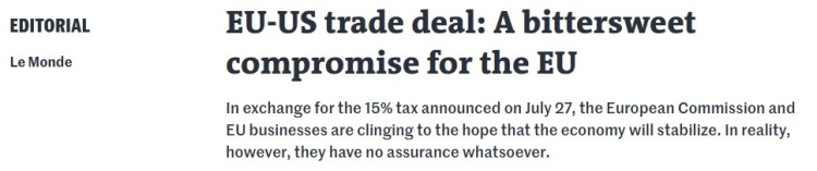 针对欧盟委员会主席冯德莱恩有关“15%的关税水平已是能争取到的最好结果”的说法,法国《世界报》直言,此次关税协议虽被包装成“不幸中的万幸”,但“非对称妥协方案”凸显出欧盟应对美国时的受制和软弱。