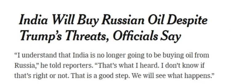 本月1日,特朗普更是在接受媒体采访时“变相施压”,称他“听说”印度打算停购俄油,但“不确定消息是否准确,但这是个积极信号,我们将拭目以待”。