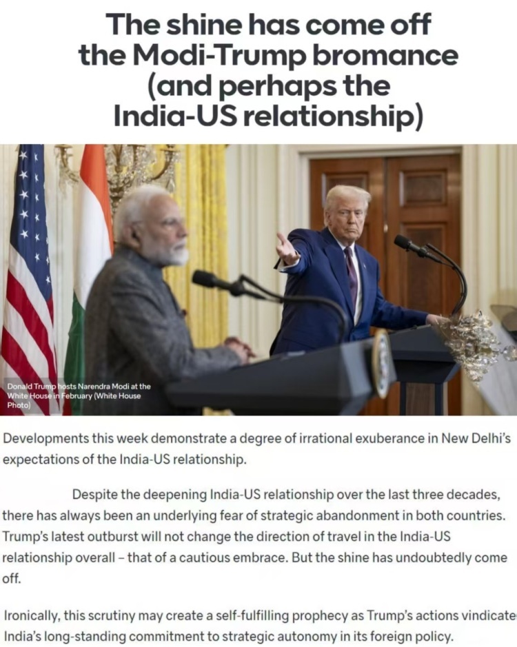 文章认为,特朗普近期的发难虽然不足以改变美印关系整体发展方向,但两国关系无疑已不复往日光彩。即便达成贸易协议,新德里也不能再相信美国是一个“天然盟友”的说法。